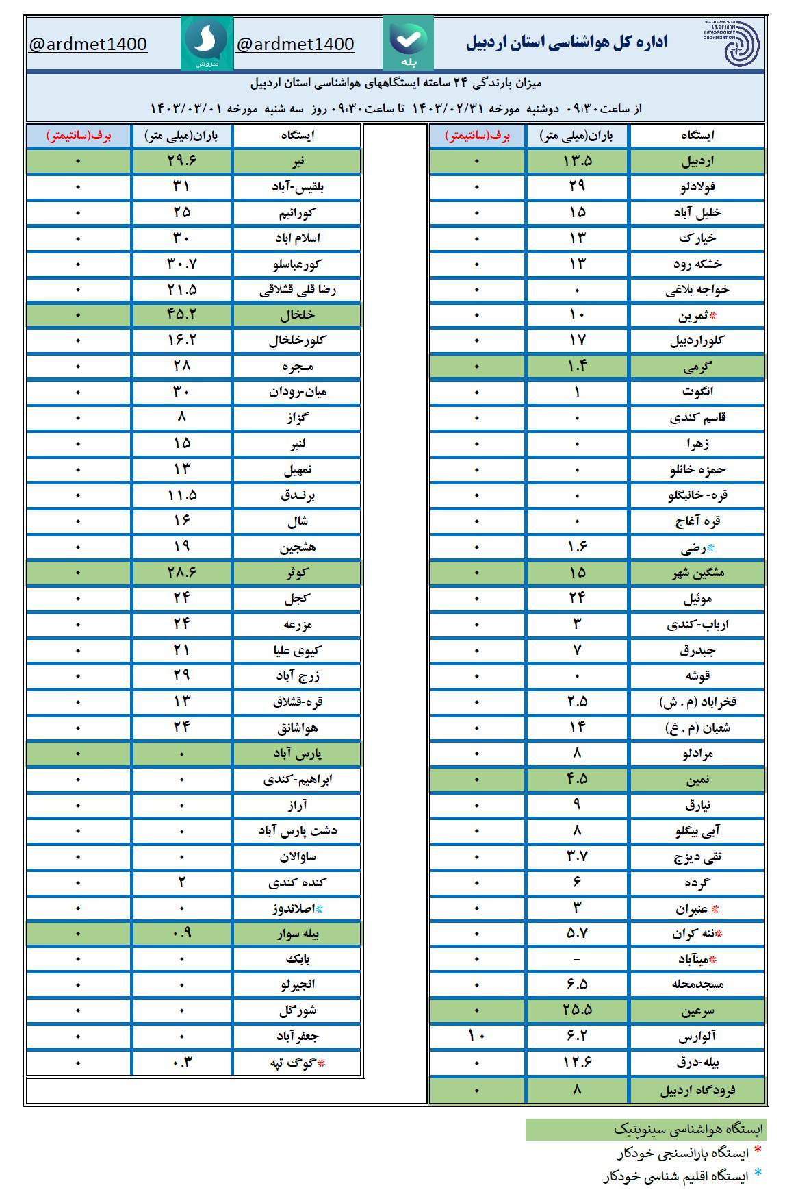 نگاهی کامل به میزان بارندگی ها در 31 اردیبهشت تا صبح اول خرداد 1403 در شهرهای مختلف استان اردبیل: